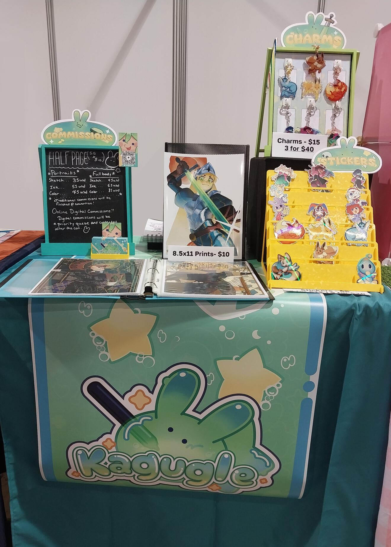 Hello, I'm Kagugle, an artist inspired by anime media and traditional painting. I create a variety of artwork; digitally painting, vector art, animations, and 3D modeling. At your convention, I plan to sell traditional and digital commissions, as well as sell charms and stickers! Feel free to explore the rest of the site or even go to the links below.